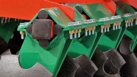 Talerze o średnicy 510 mm mocowane są na podwójnej nodze amortyzowanej w układzie czterech gumowych elastomerów. Chronią one skutecznie talerze przed uszkodzeniami. Amortyzatory niwelują dodatkowo drgania przenoszone na maszynę. Pracuj bez obaw, bez przerw.