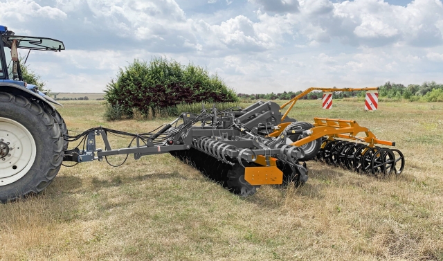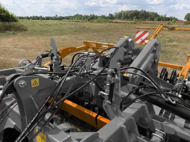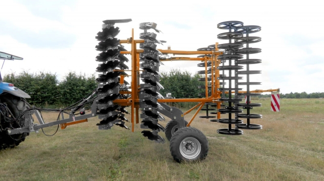 Brona talerzowa na kołach TAL-K to kolejna maszyna z zabezpieczeniem sprężynowym. Jej charakterystycznym elementem jest zintegrowane podwozie jezdne umiejscowione pomiędzy drugim rzędem talerzy a wałem. To umiejscowienie podwozia jezdnego będącego podczas pracy nad środkową ramą maszyn pozwala uniknąć drgań i wibracji przenoszonych z ciągnika na bronę talerzową. Niezawodny system talerzy na bezobsługowych łożyskach zapewnia wysoką jakość mieszania i wyrównania. Szeroka gama wałów zapewnia prawidłowe rozdrobnienie i wyrównanie pola pod siew. Będąca w standardzie w TAL-K hydrauliczna regulacja głębokości pracy znacząco ułatwia ustawienie głębokości pracy maszyn, co ma ogromnie znaczenie w trudnych polowych warunkach. Szybka uprawa ścierniska odbywa się w towarzystwie standardowych ekranów bocznych i ekranu środkowego zamontowanego pomiędzy talerzami.
