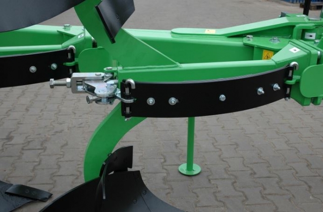 Regulacji dokonuje się w łatwy sposób poprzez odpowiednie przestawienie śruby regulacyjnej na każdym siodle korpusu na ramie pługa.