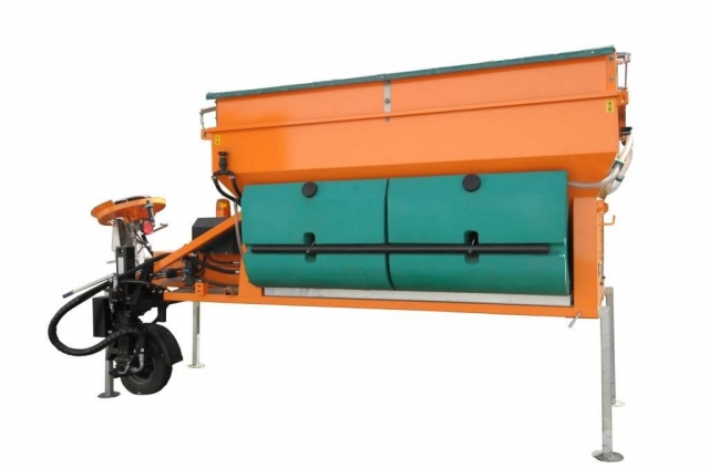 Posypywarka PRONAR KPT40 służy do powierzchniowego rozrzucania materiałów uszorstniających (piasek, kruszywo) oraz środków chemicznych (chlorek sodu, chlorek wapnia, chlorek magnezu, solanka) do zimowego utrzymania dróg. Posypywarka PRONAR KPT40 posiada opatentowany przez nas system regulacji pojemności zasobnika, co pozwala na zmianę pojemności skrzyni ładunkowej z 4,5 do 6 m3. Może być agregowana na pojazdach ciężarowych wyposażonych w platformę ładunkową oraz spełniających wymagania zawarte w tabeli. Model KPT jest wyposażony w dodatkowe zbiorniki solanki do zwilżania rozsypywanej soli.