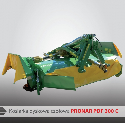 Kosiarka dyskowa Pronar PDF 300C czołowa ze spulchniaczem to nowoczesna, zbudowana w oparciu o najnowsze materiały i technologie kosiarka. Nowoczesna stylistyka, zwarta, mocna a zarazem lekka konstrukcja, z dużym zakresem kopiowania (510 mm licząc od pozycji pracy: w górę 270 mm i w dół 240 mm). Kopiując teren, listwa tnąca ustawia się pod kątem +7 i -6 w stosunku do gruntu. Taka praca zawieszenia zapewnia czyste i estetyczne cięcie oraz właściwą wysokość koszenia. Ciągnik do współpracy z kosiarkami czołowymi powinien być wyposażony w przedni TUZ i WOM oraz posiadać (z przodu) jedną sekcję hydrauliczną. Do napędu kosiarki wystarczy ciągnik o mocy 60 KM lub 75KM . Kosiarka dyskowa PRONAR PDF300C (PDF300) czołowa może być łączona w zestaw z kosiarką tylną PDD 830. Szerokość robocza takiego zestawu wynosi 8,3 m.