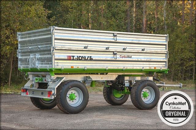 T-104/6 to najnowszy model przyczepy w palecie CynkoMet stworzony z myślą o rolnikach dla których liczy się efektywność i wielofunkcyjność. Cynkowane ogniowo ściany, rama dolna, belka tylna, błotniki, dyszel, rama obrotnicy. Podłoga z jednego arkusza grubości 4mm, gruntowana zanurzeniowo i malowana, gwarantuje niezawodność, trwałość przez wiele lat użytkowania. Skrzynia posiada szerokość paletową. Masywna konstrukcja wykonana z profili hutniczych gwarantuje stabilne i komfortowe użytkowanie przy największych obciążeniach i w najtrudniejszych warunkach. Ściany wykonane z solidnych walcowanych profili. Możliwość otwierania ścian pojedynczo lub zespołowo od góry i dołu. W tylnej ścianie znajduje się otwór wsypowy pozwalający na wyładunek strumieniowy sypkich materiałów. Bieżnikowane ogumienie z możliwością zakupu nowych. Założenie dodatkowych nadstaw gwarantuje zwiększenie pojemości ładunkowej. Homologacja umożliwia rejestrację przyczepy i poruszanie się po drogach publicznych. Zaczep typu Y znacząco ułatwia manewrowanie maszyną.