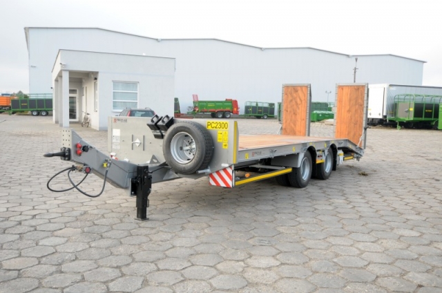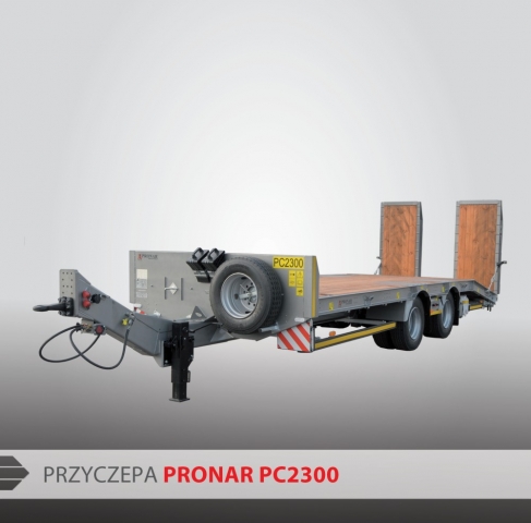 Przyczepa PRONAR PC2300 niskopodwoziowa to doskonałe rozwiązanie w transporcie wszelkiego rodzaju maszyn, np. rolniczych i budowlanych oraz ładunków – jest wyposażona w zabezpieczenia nie pozwalające na przemieszczanie się ładunku. Konstrukcja przyczepy oparta jest na profilu o przekroju dwuteownika, gęsto użebrowanego belkami poprzecznymi, co zapewnia wysoką wytrzymałość konstrukcji na zginanie. System hamulcowy posiada w standardzie system EBS wraz z funkcją RSP, który poprawa stabilność pojazdu.