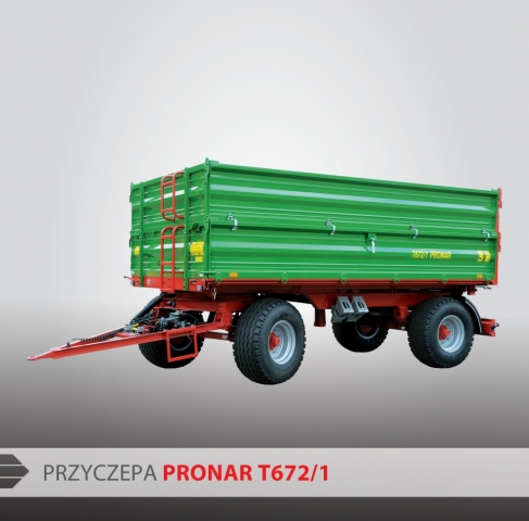 Przyczepa Pronar T672/1 przeznaczona jest do transportu płodów rolnych, produktów rolnych, materiałów budowlanych, nawozów mineralnych oraz innych ładunków. Przyczepa ma ładowność 10 ton, wyposażona jest w trójstronny system wywrotu, błotniki kół tylnych, tylny zaczep manualny i szyber zsypowy do ziarna w tylnej ścianie przyczepy. W zależności od potrzeb przyczepę można wyposażyć w instalację hamulcową pneumatyczną lub hydrauliczną. W wersji opcjonalnej można wybrać wiele doposażeń takich jak: plandeka ze stelażem, balkon, koło zapasowe, dodatkowe nadstawy, różne rozmiary ogumienia.