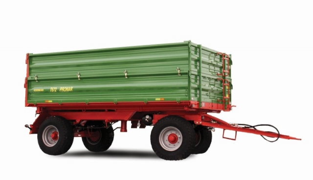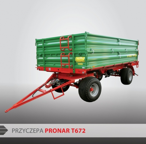 Przyczepa Pronar T672 przeznaczona jest do transportu płodów rolnych, produktów rolnych, materiałów budowlanych, nawozów mineralnych oraz innych ładunków. Przyczepa ma ładowność 8 ton, wyposażona jest w trójstronny system wywrotu, błotniki kół tylnych, tylny zaczep manualny i szyber zsypowy do ziarna w tylnej ścianie przyczepy. W zależności od potrzeb przyczepę możemy wyposażyć w instalację hamulcową pneumatyczną lub hydrauliczną. W wersji opcjonalnej można doposażyć ją w plandekę ze stelażem, balkon, koło zapasowe, dodatkowe nadstawy, różne rozmiary ogumienia.